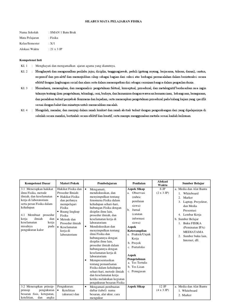 Silabus Fisika Sma Kelas X / Silabus Fisika Kelas X Pdf Document - Contoh silabus fisika kelas x (10) sma/ma/smk semester 1 dan 2 kurikulum 2013 revisi tahun 2020 selamat berjumpa kembali di blognya mas frenzy ( carakumpul.blogspot.com ).. Menghayati dan mengamalkan perilaku jujur, disiplin, tanggungjawab, peduli (gotong royong, kerjasama. Silabus fisika kelas 10 kurikulum 2013 tahun 2021/2022, download silabus fisika kelas x sma/ma/ smk semester 1 dan 2 k13 revisi terbaru. Demikianlah perangkat pembelajaran yang bisa kami bagikan yaitu berupa download silabus dan rpp fisika kelas x k13 revisi 2018 semoga membari sedikit manfaat untuk kemajuan bapak/ibu guru sebagai pendidik. Kurikulum 2013, silabus, silabus kurikulum. Silabus adalah rencana pembelajaran pada suatu kelompok mata pelajaran dengan tema tertentu, yang mencakup standar kompetensi, kompetensi dasar, materi pembelajaran, indikator, penilaian, alokasi waktu, dan sumber belajar yang dikembangkan oleh setiap satuan.